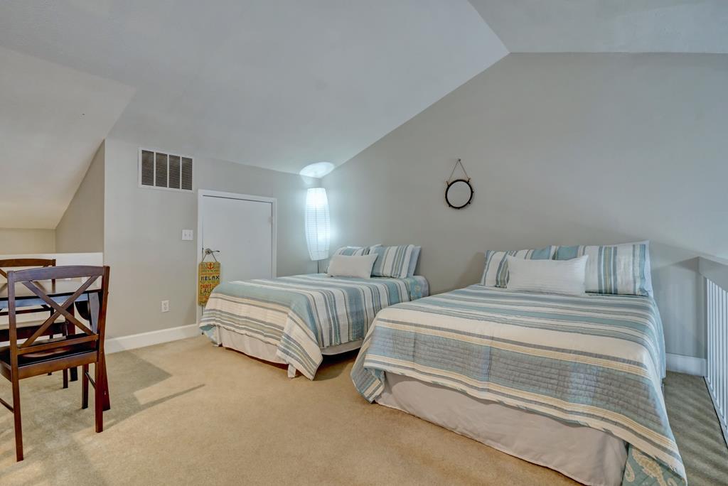 Experience the charm of island living in this beautifully renovated condo situated on the top floor in Surf City. This updated two-bedroom unit is stylishly appointed for your relaxation. Upon arriving at the gated Surf Condos community, you'll appreciate the off-street parking available. Inside the condo, you'll discover vaulted ceilings throughout, creating a bright and spacious atmosphere. The master bedroom, located on the first level, features a queen-sized bed, a TV, and an en-suite bathroom. As you continue down the hallway, you'll find a modern hall bathroom and a fully renovated custom kitchen, complete with a granite island, new fixtures, and all the essential cooking tools for preparing home-cooked meals while on vacation. Adjacent to the kitchen is the inviting living area, where the vaulted ceilings are highlighted by the loft above and a large sliding glass door that opens to your private deck. The living room is equipped with a large TV and comfortable seating for you and your visitors. The loft upstairs serves as a second bedroom, furnished with two full-sized beds and a TV. The covered deck measures 8x16 and provides an ideal spot to take in views of the Atlantic Ocean, along with access to two designated beach pathways, a professionally landscaped courtyard, and a community pool. The pool area boasts various shaded spots, zero-grade entry, and multiple seating alternatives. Additionally, there is an on-site laundry facility, a community grilling area, and a shower/foot wash station conveniently located at each beach access point.