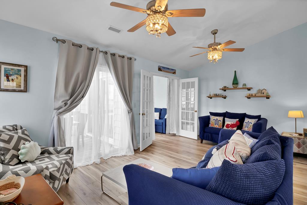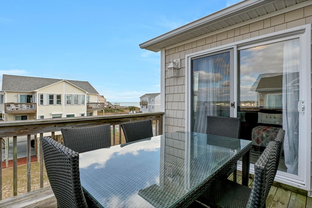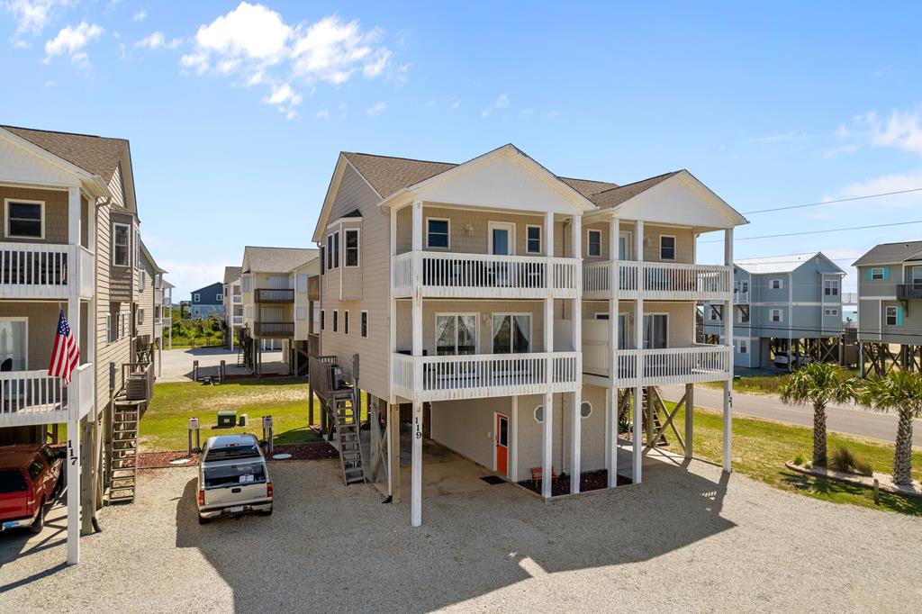 Step into this delightful duplex featuring 4 bedrooms and 2 bathrooms, positioned on the second row with breathtaking ocean vistas! Upon arriving in the driveway, you’ll immediately appreciate the sheltered parking space and welcoming entrance. Each morning, savor a cup of coffee while listening to the soothing sound of waves and watching the sunrise from one of your four private decks, each offering its own stunning view. Inside, you will be welcomed by an abundance of natural light filtering through multiple windows in the expansive great room. This area showcases an open layout with ample living space alongside a fully stocked kitchen. The living area provides plenty of seating options and includes a flat-screen smart TV with YouTube TV available for your enjoyment. Adjacent to the kitchen, the dining area comfortably accommodates up to 8 adults, making it an ideal setting for playing cards, completing puzzles, or enjoying board games with family. Just off this area, discover your fourth bedroom, which doubles as a cozy lounge featuring a full futon. This room boasts its own sliding glass door allowing direct access to the back deck. The top floor is complete with a full bathroom, while the middle floor hosts the remaining three bedrooms. The master bedroom is equipped with a queen bed and a flat-screen TV, along with an ensuite bathroom that offers a luxurious soaking tub. The other two bedrooms include another queen bed and a twin-over-full bunk bed. Additionally, this floor features another full bath for convenience. Every bedroom has floor-to-ceiling sliding glass doors that let in natural light and provide generous storage for your vacation essentials. This property also includes a stackable washer and dryer. Just a few steps from the spacious gravel driveway, there is public beach access available for your enjoyment. This lovely duplex is conveniently situated just 10 miles from downtown Surf City and offers easy access to Wilmington and Jacksonville.
