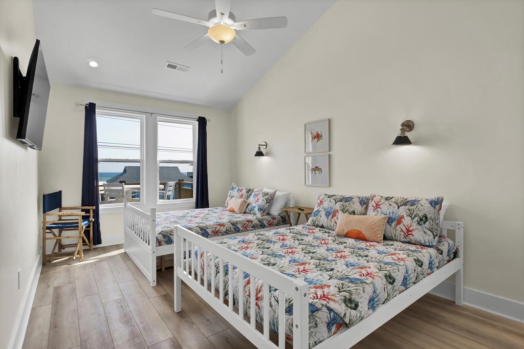 Ascending to the top floor, you'll find the fourth bedroom, which features two Full-size beds, making it an ideal retreat for guests of all ages after a day of beach fun. The top floor boasts an open-concept layout filled with natural light, creating a perfect gathering space for quality time with loved ones.
